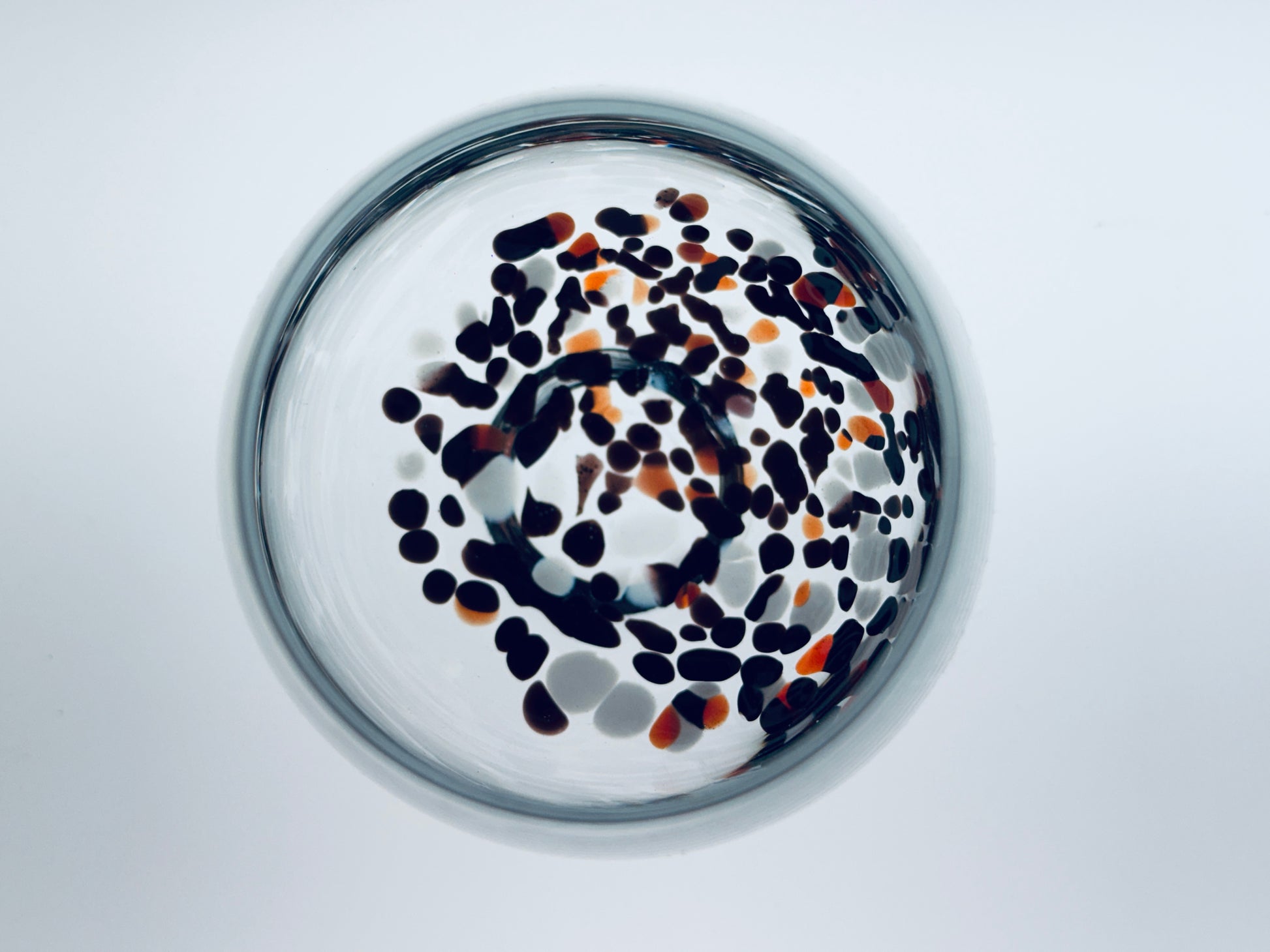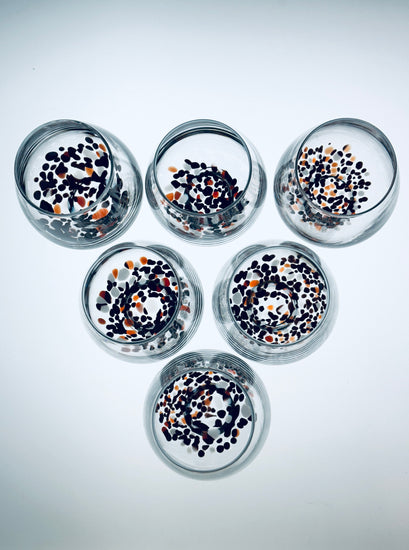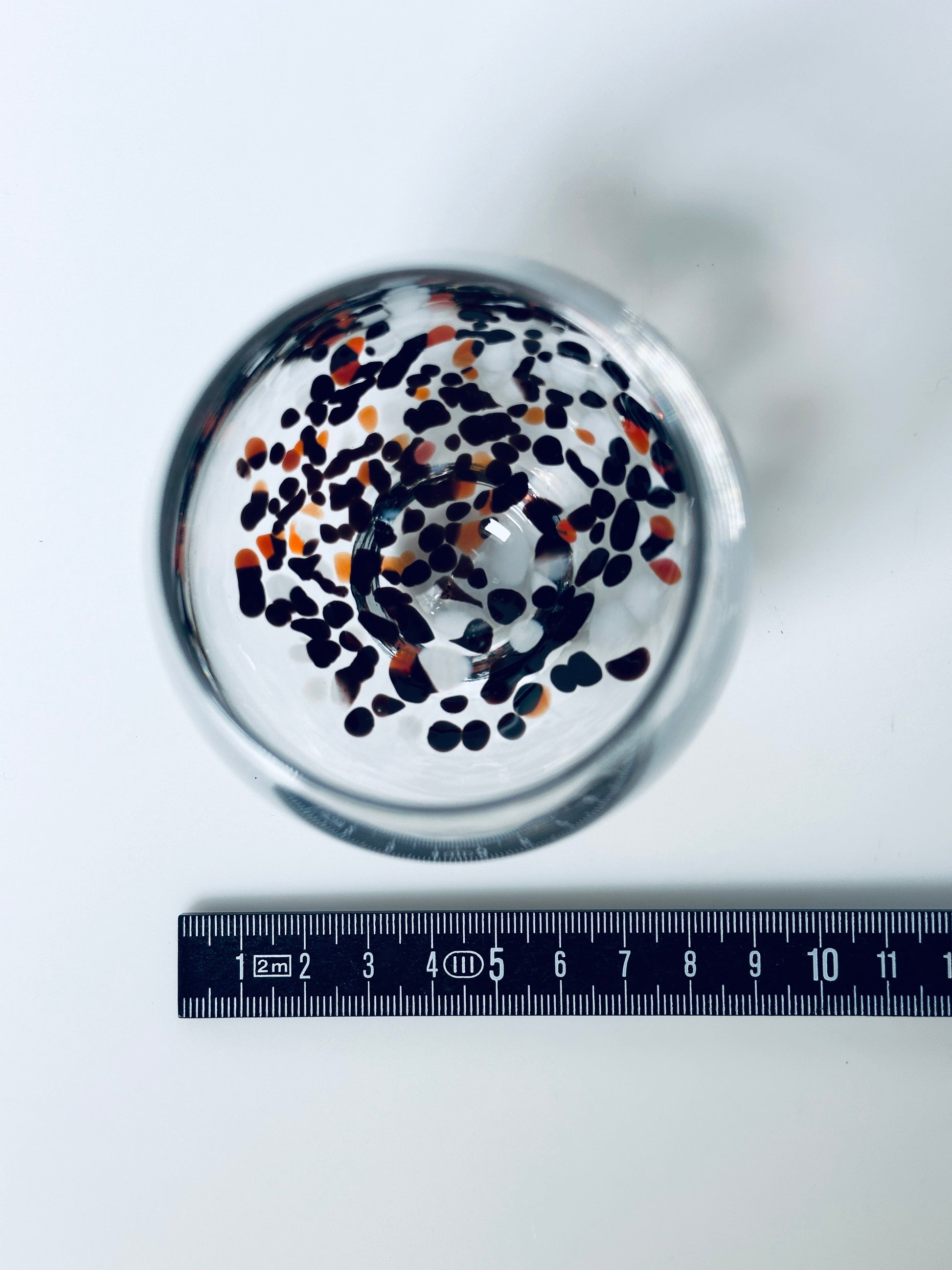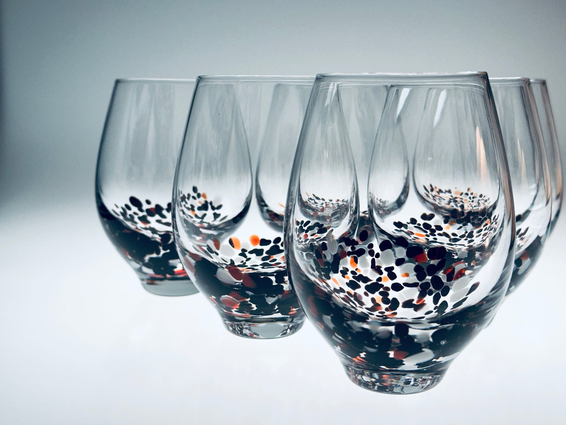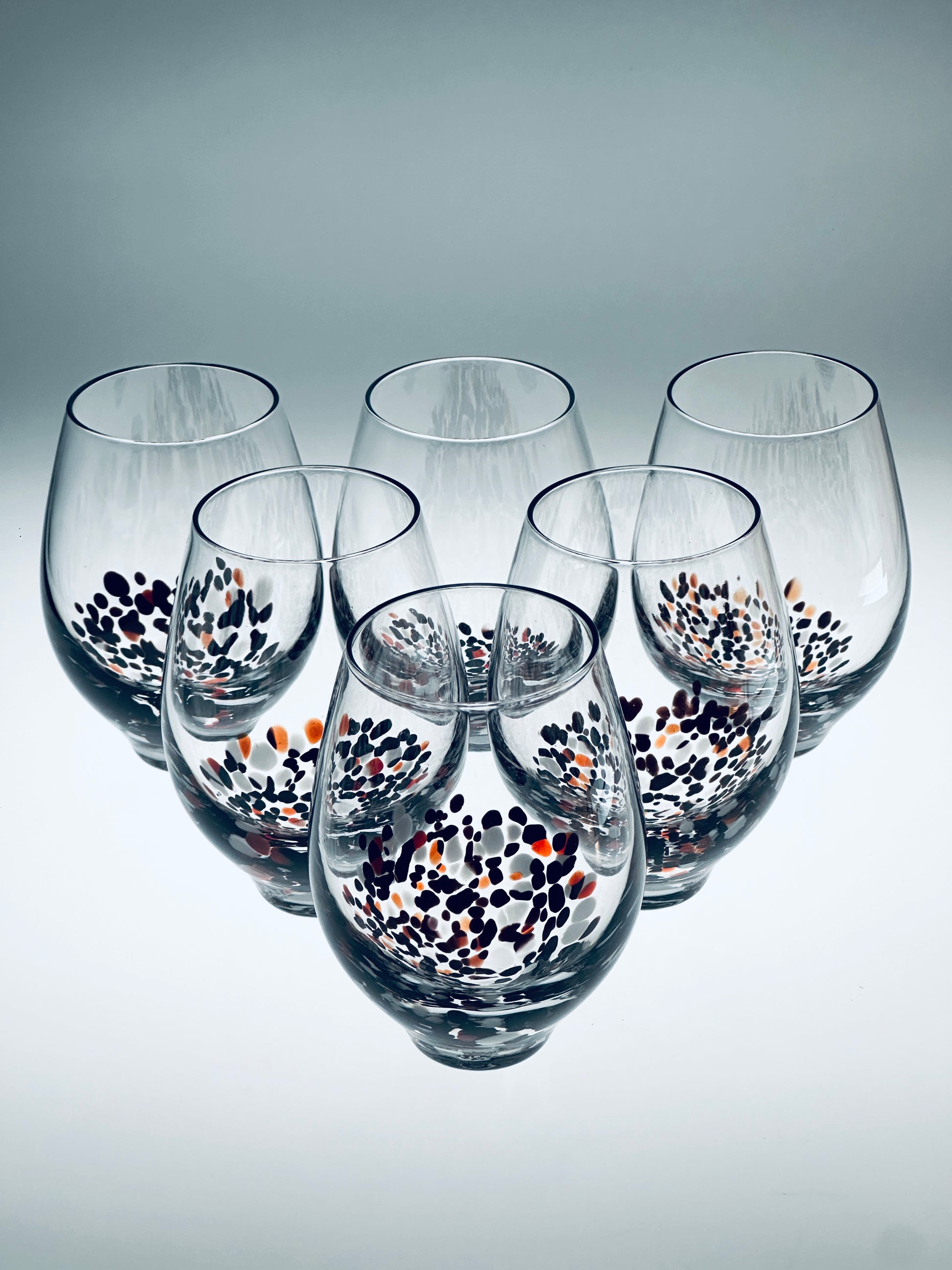 6 Weingläser, Entwurf von Johanna Jelinek für Ikea, 1990er Jahre. Das stiellose auf einer schmalen Basis stehende Weinglas liegt wundervoll in der Hand und besticht durch seine Form und die unregelmässig regelmäßig im Glasbodenbereich verteilten farbigen Punkte.
