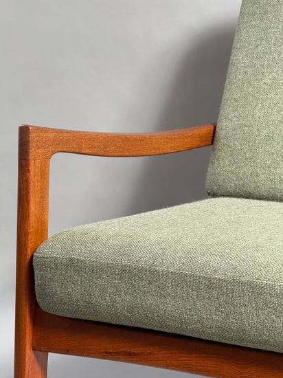 Das Gestell aus massivem Teakholz und die originalen Polster aus robustem, grünem Wollstoff weisen partiell leichte Gebrauchsspuren auf, befinden sich aber insgesamt in sehr gutem, gepflegtem Zustand und kommen aus einem haustierfreiem Nichtraucherhaushalt.