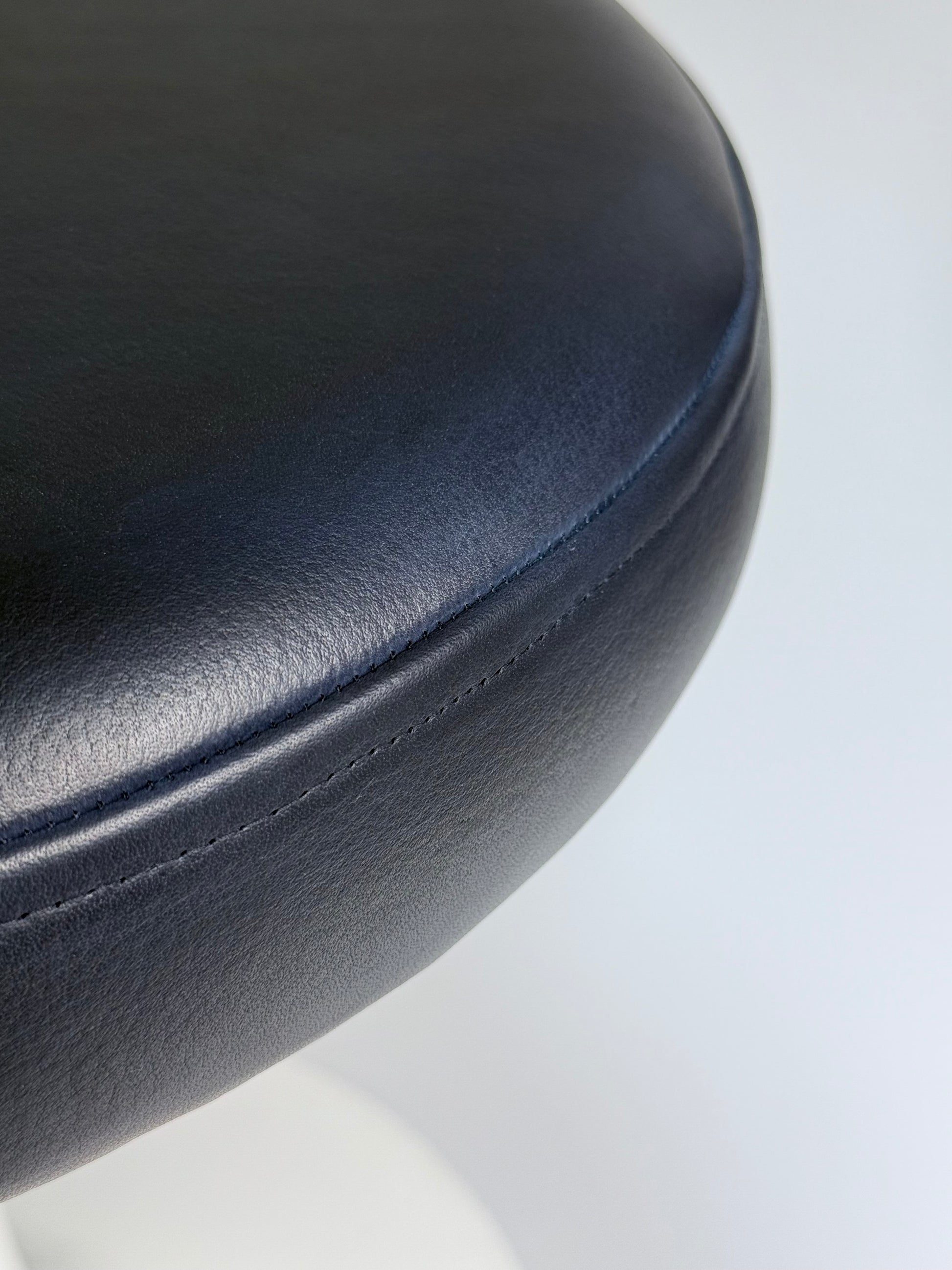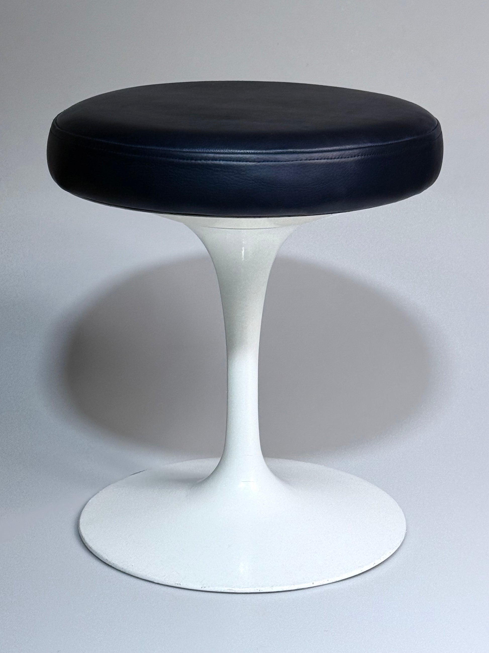 Die Sitzfläche wurde fachgerecht neu mit hochwertigem Echtleder in Marineblau bezogen, das Polster selbst ebenso erneuert. Elegante, zeitlose Farbgebung, die hervorragend mit klassischen Tulip-Ensembles harmoniert, aber auch als Solitär funktioniert.