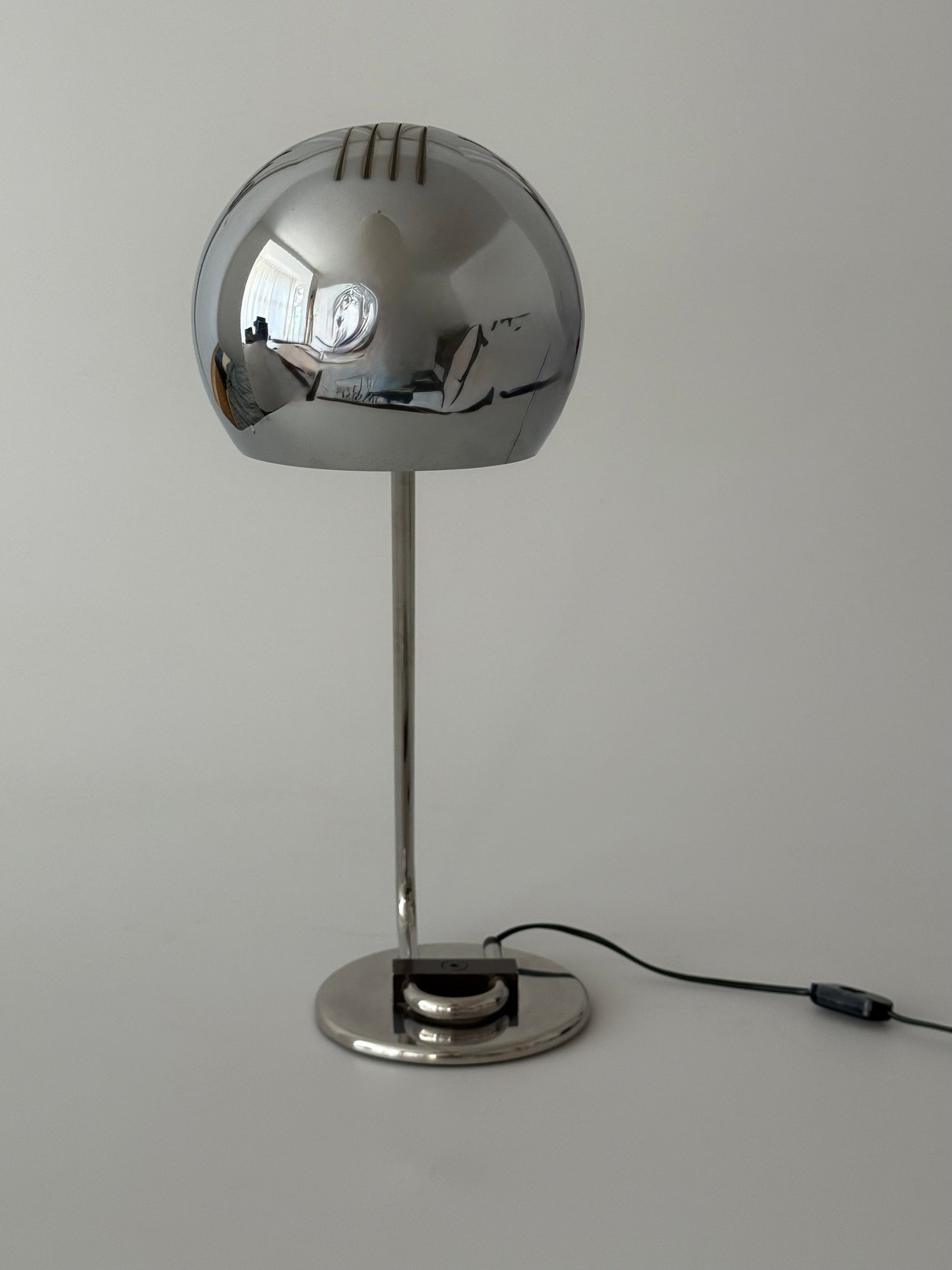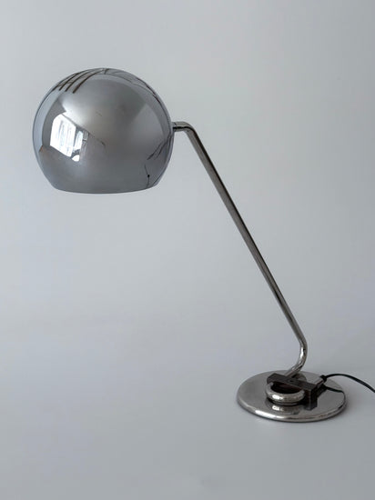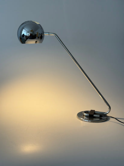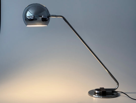 Die ikonische Schreibtischlampe mit schwenkbarem Eyeball- Kopf trägt die futuristische Formensprache und Funktionalität des modernistischen Designs der 1970er Jahre, ist hochwertig und robust gearbeitet und befindet sich in gutem Zustand mit wenigen gebrauchsbedingten Alterungsspuren, wie unscheinbaren Kratzern, hauptsächlich im Fußbereich, siehe Bilder.