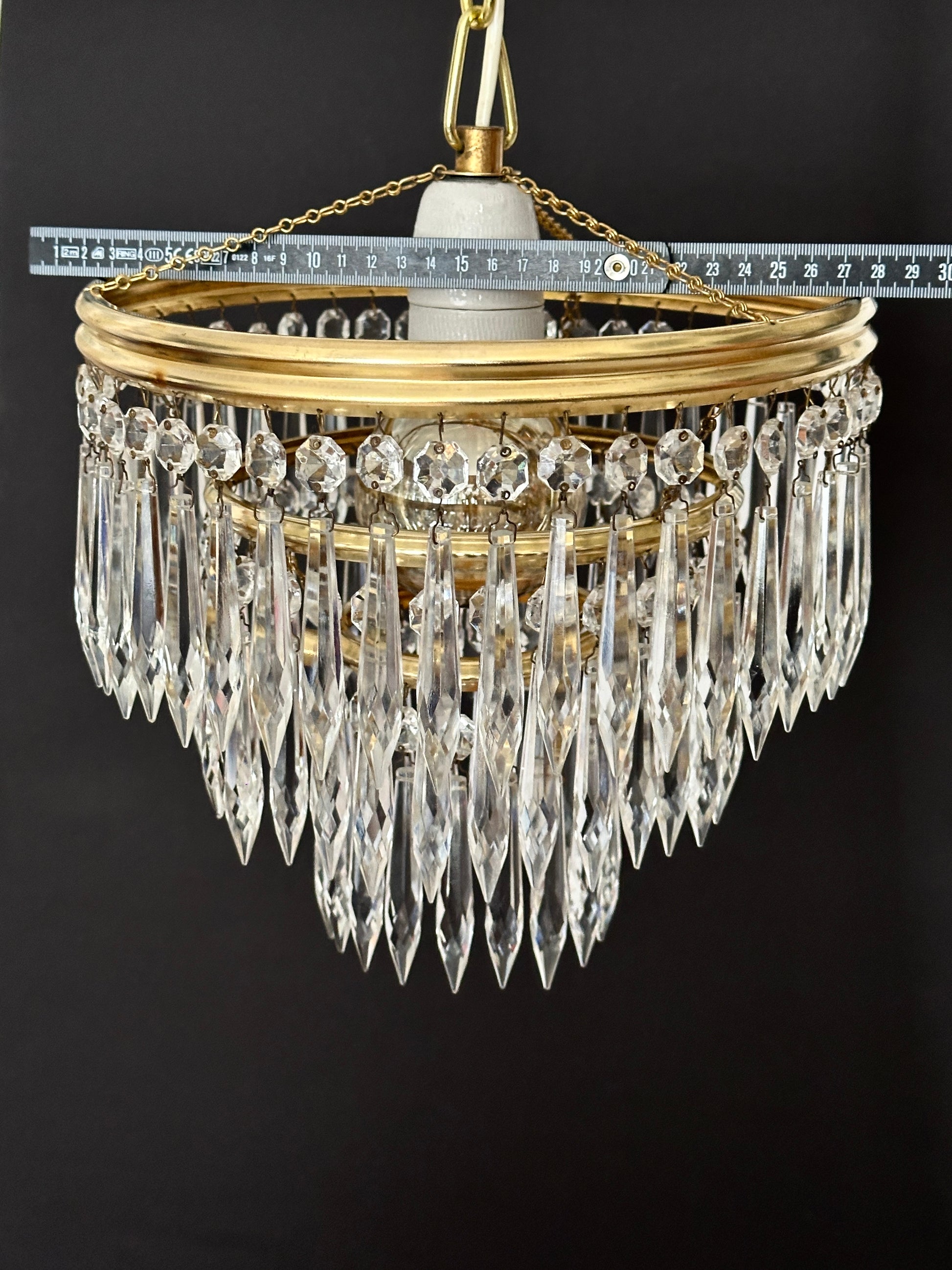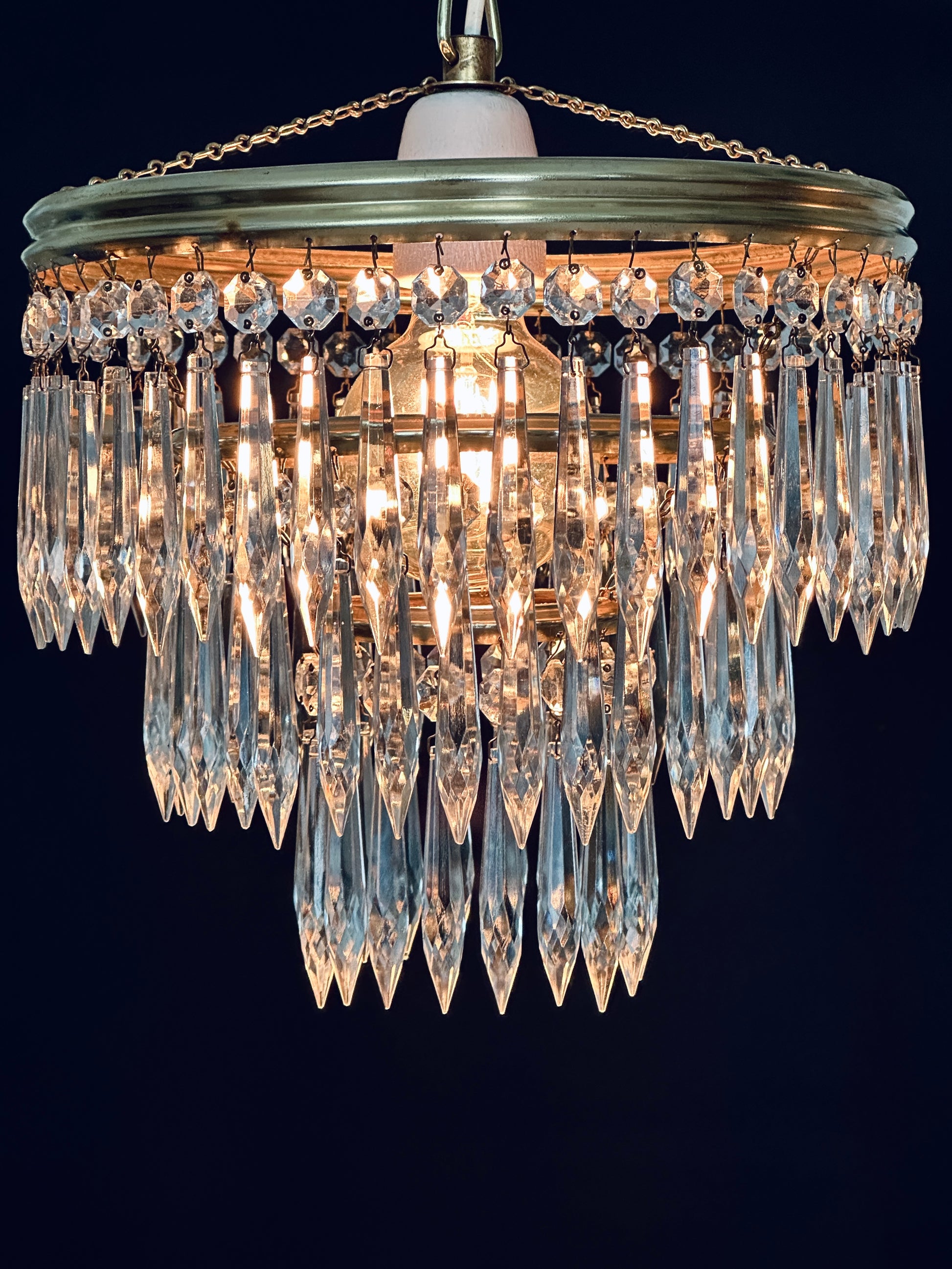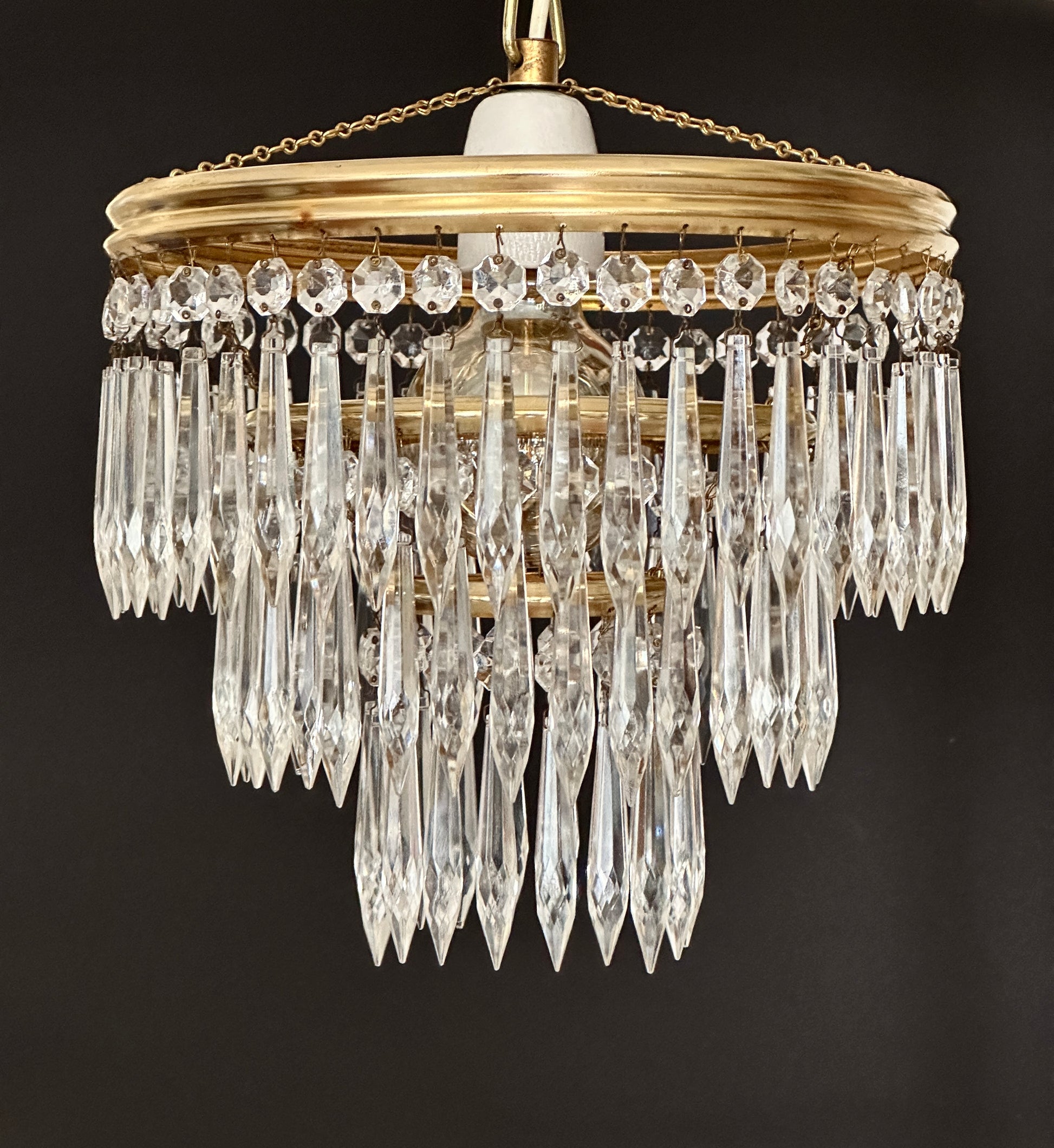 Kleiner charmanter Kronleuchter mit Kristallbehang und einer E27-Fassung, 1970er Jahre. Er ist sehr gut für kleinere Räume geeignet. Er wurde gereinigt und poliert, ist voll funktionsfähig und in sehr gutem Zustand.