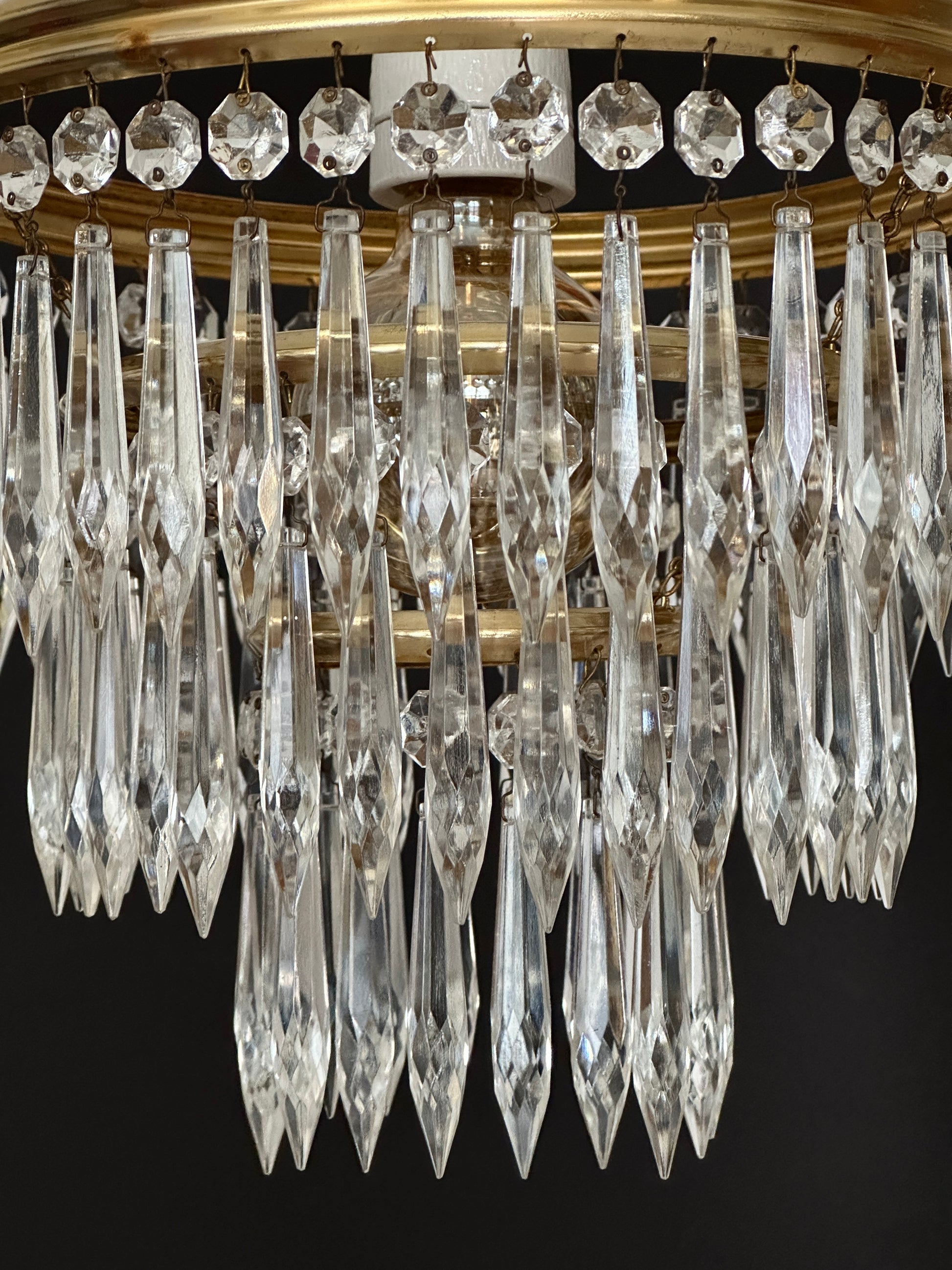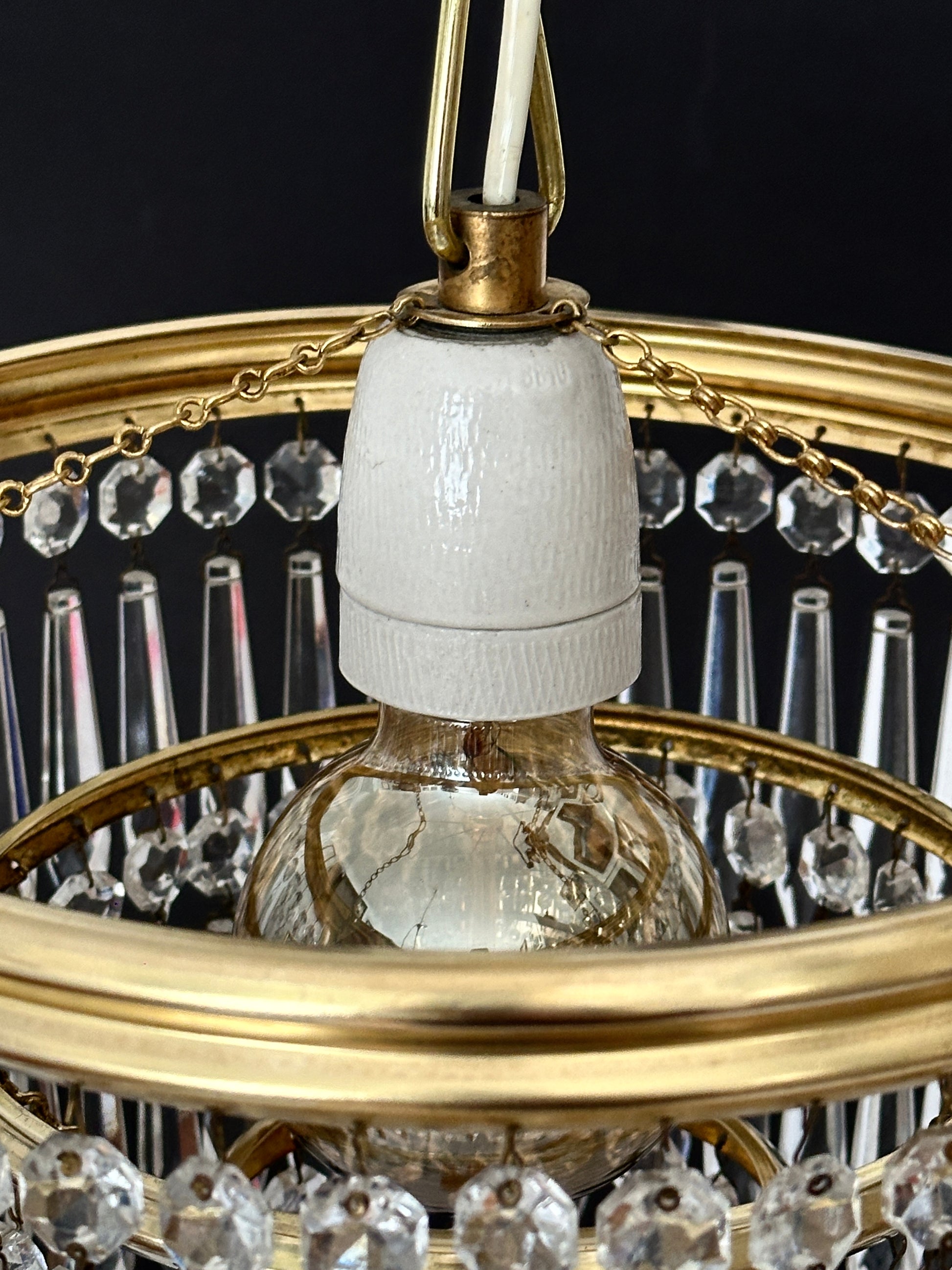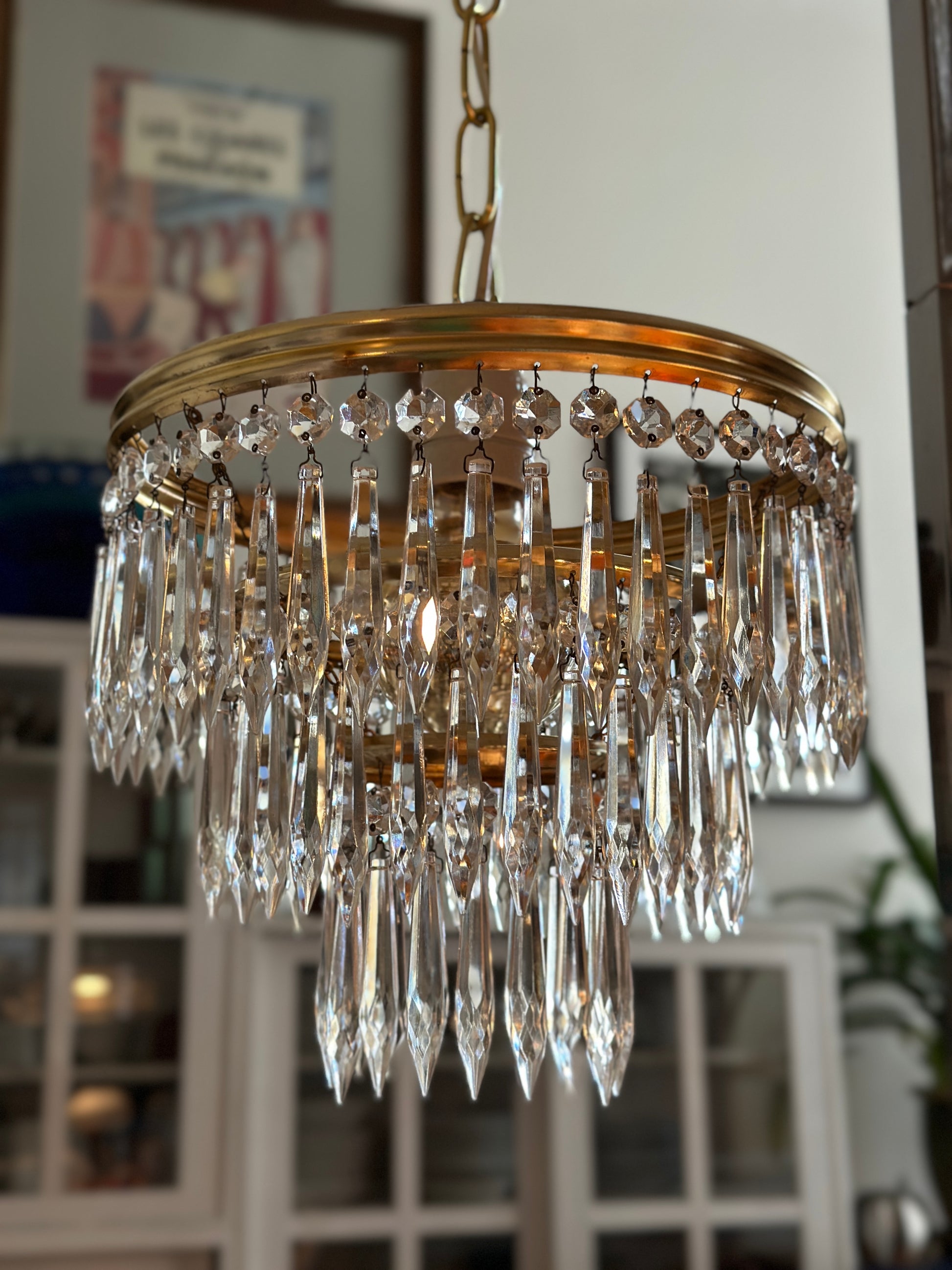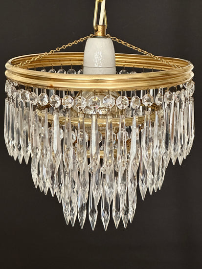 Kleiner charmanter Kronleuchter mit Kristallbehang und einer E27-Fassung, 1970er Jahre. Er ist sehr gut für kleinere Räume geeignet. Er wurde gereinigt und poliert, ist voll funktionsfähig und in sehr gutem Zustand.