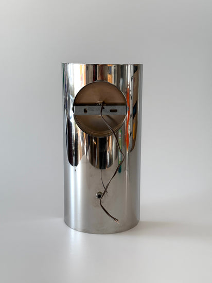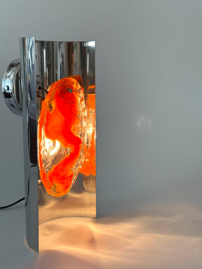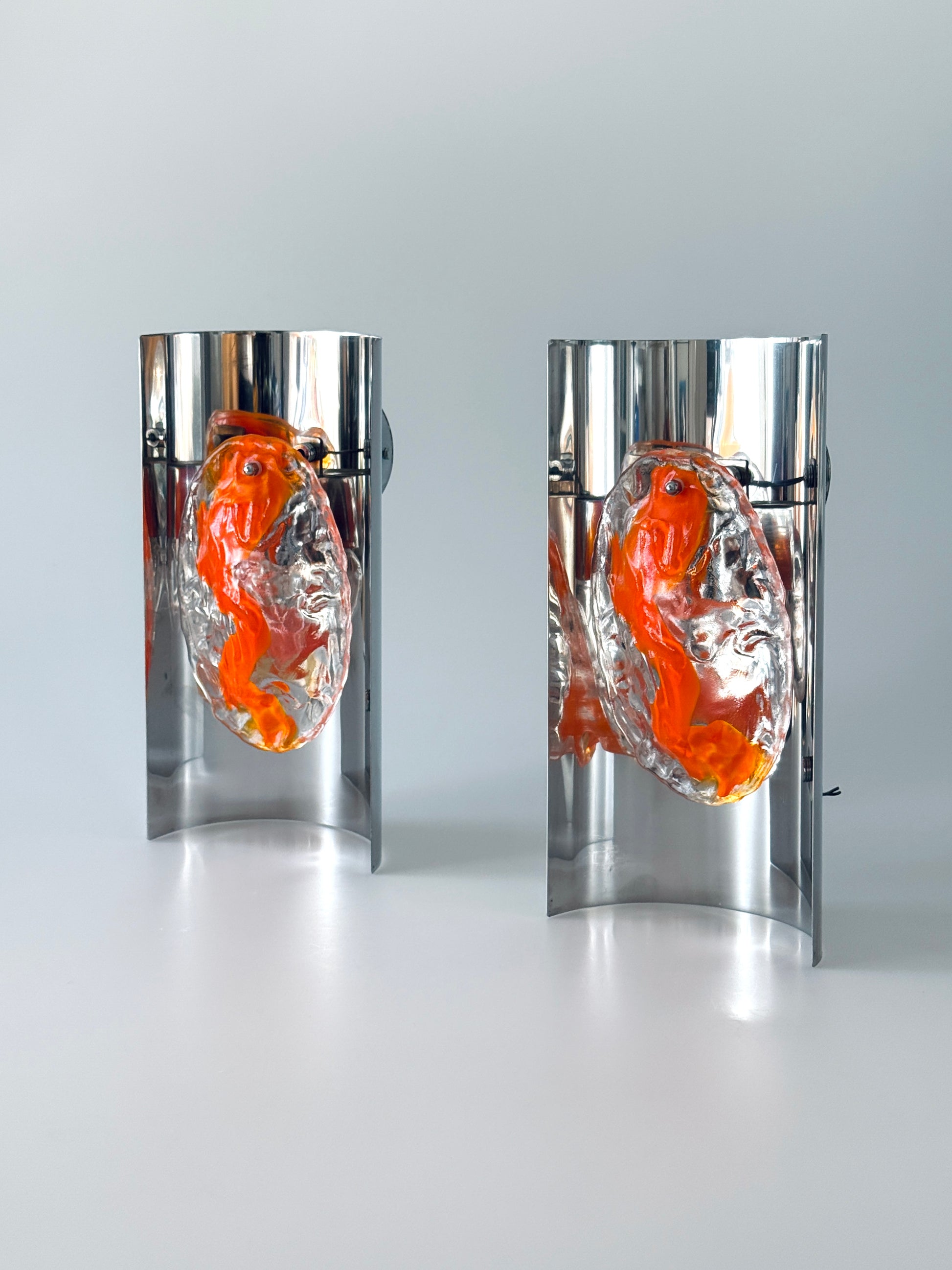Das ovale handgefertigte transparente Murano Glas mit oranger Einfärbung reflektiert das Licht indirekt und elegant vor dem halbzylindrischen Träger aus verchromtem Stahl. Die Leuchten sind ohne jegliche Beschädigung mit nur minimalen Gebrauchsspuren in Form von Kratzern. Sie verfügen über jeweils eine E14 Fassung und können mit handelsüblichen LED-Leuchtmitteln oder klassischen Leuchtmitteln bis 40 Watt bestückt werden. Sie wurden gereinigt, poliert und die Funktionsfähigkeit überprüft.