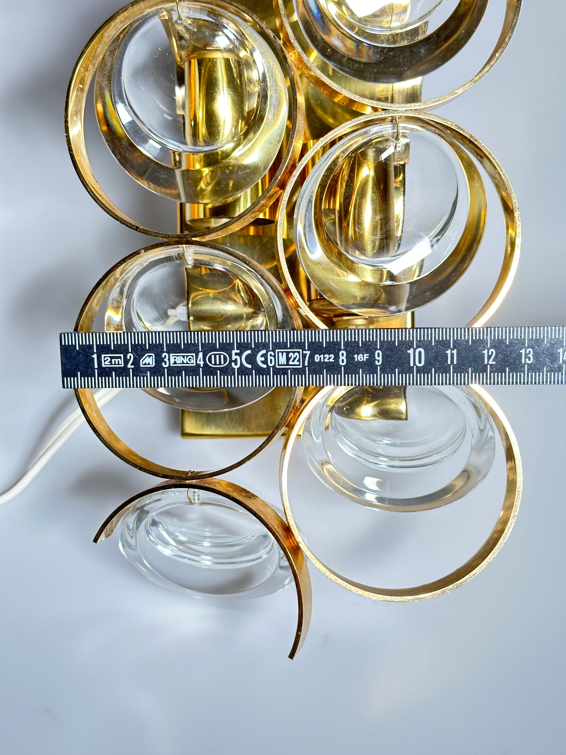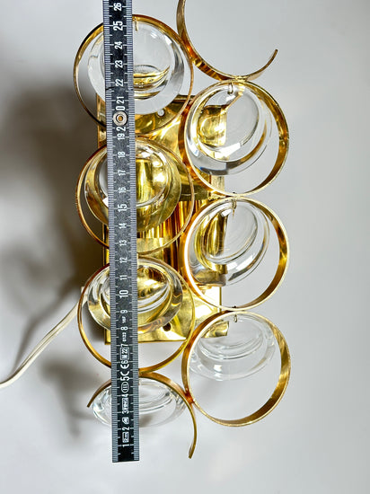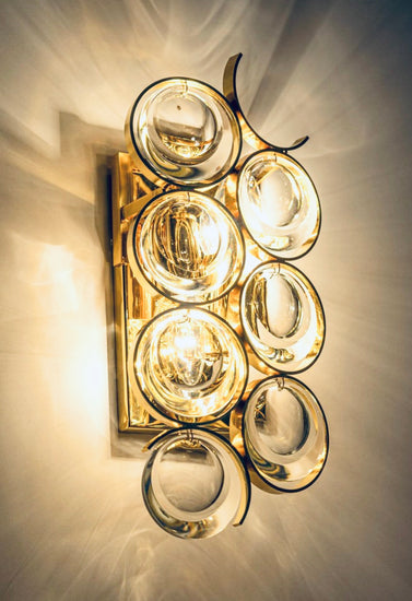 Vergoldete Wandleuchte aus Messing mit Kristallbehang aus runden facettierten Scheiben, hergestellt von Palwa, Deutschland, 1960er Jahre. In sehr gutem Zustand, mit nur minimalen Gebrauchsspuren, auf Funktionsfähigkeit geprüft, gereinigt und poliert.