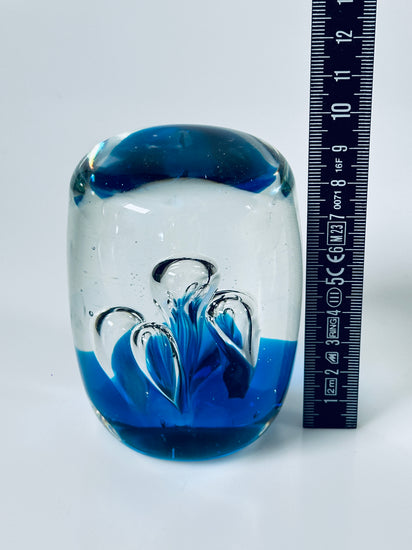 Schwerer Briefbeschwerer mit Schwefelglas-Blasen, 1970er Jahre, blaue Basis, Handarbeit. Ungewöhnliche Form, zylinderartig abgerundet.