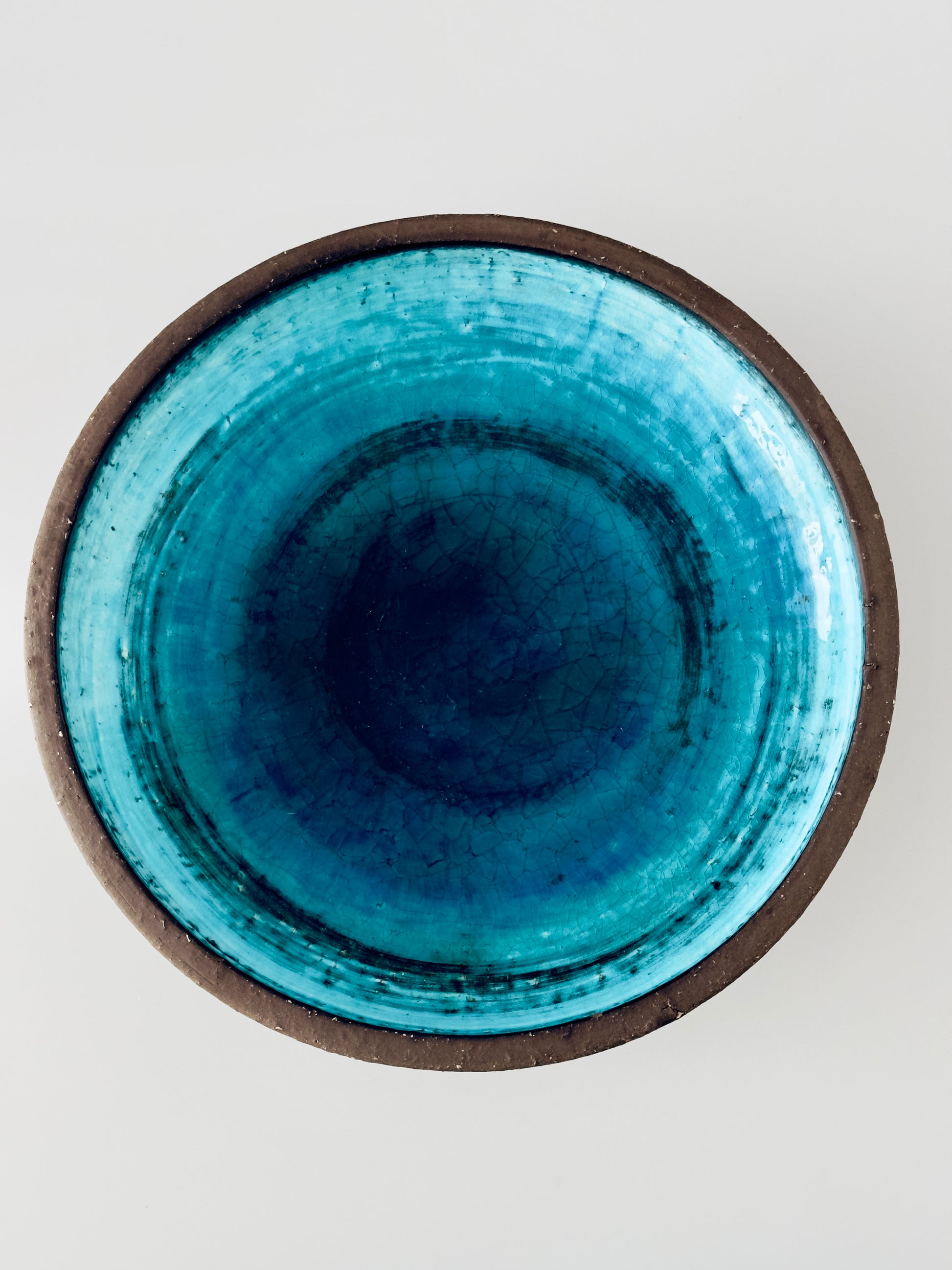 Diese ungewöhnliche Schale wurde in den 1960er Jahren von der Keramikwerkstatt Krösselbach unter damaliger Leitung von Cläre und Carla Schließer hergestellt, und besticht durch die Kombination von sehr rauer schwarzbraun brennender Mangan-Schamotte-Masse in Verbindung mit einer hochglänzenden türkisblauen Craquelé-Glasur. Die seltene Schale kann als Obstschale oder Wandteller genutzt werden.