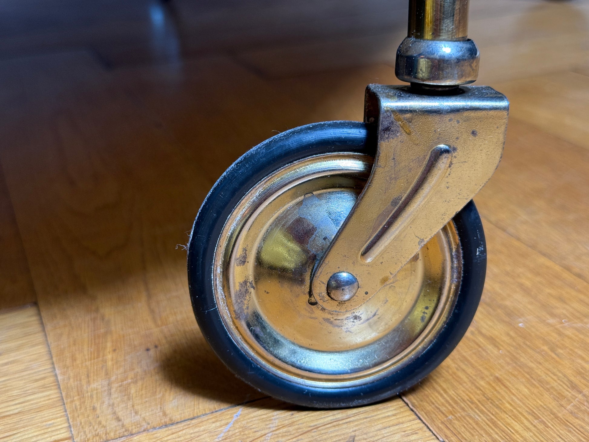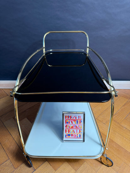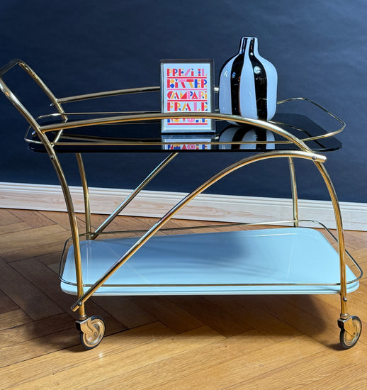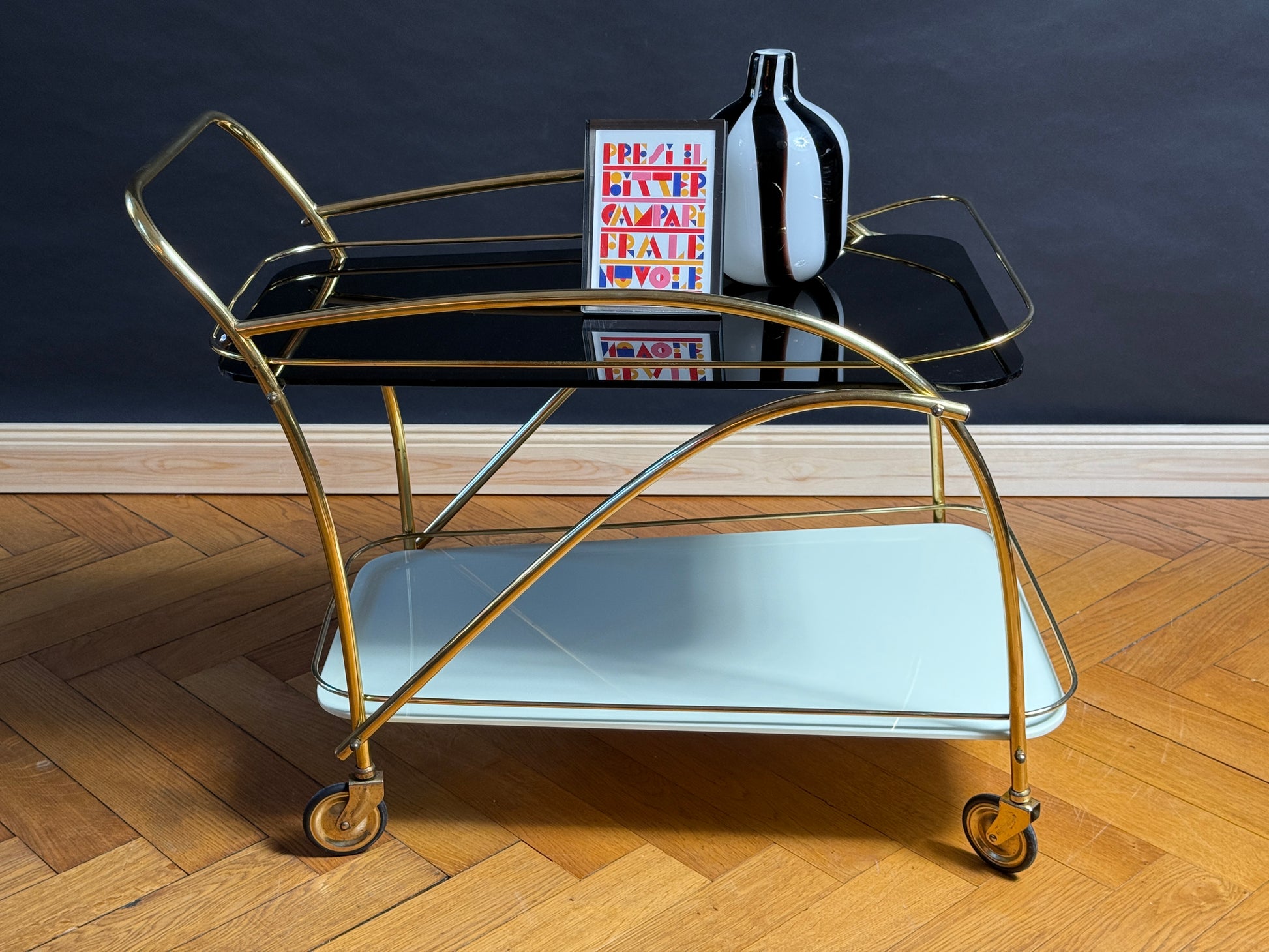 Servierwagen aus farbigem Glas und Messing, Italien, 1950er Jahre. Der Barwagen hat zwei herausnehmbare Glasplatten, und besteht komplett aus Messing. Die Glassplatten sind hochglänzend schwarz und warmweiss, die jeweilige Unterseite ist geriffelt. Der Zustand ist insgesamt sehr gut, die Glasplatten weisen einige Kratzer auf, eine kleine Abplatzung an der Unterseite ist kaum mit dem Auge auszumachen., siehe Bild. Die Rollen zeigen partiell Gebrauchs- und Oxidationsspuren. Alles übrige ist in sehr gutem Zustand. Er wurde gründlich gereinigt und poliert.