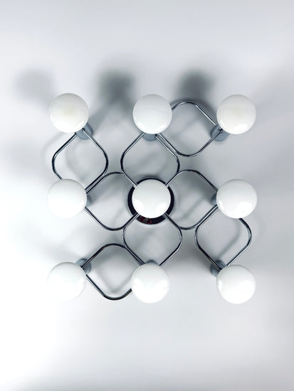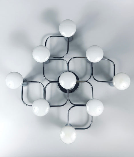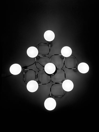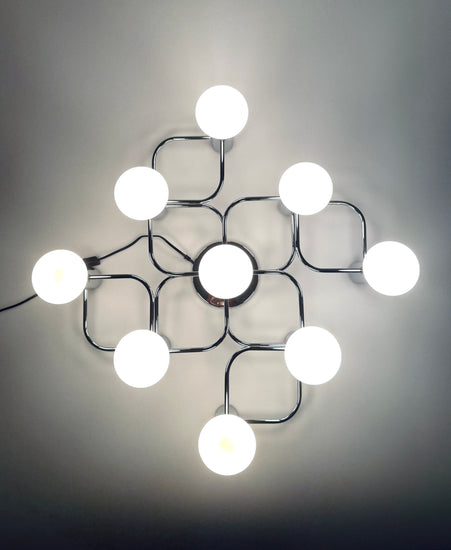 Die hochwertig verarbeitete Lampe verfügt über neun E27- Fassungen aus Porzellan und besteht aus verchromten Metall. Sie kann sowohl an der Wand als auch an der Decke befestigt werden. Geeignet sind Leuchtmittel bis 40 Watt, auch passend für alle gängigen LED-Leuchtmittel. Die abgebildeten sind nicht Teil des Lieferumfanges.