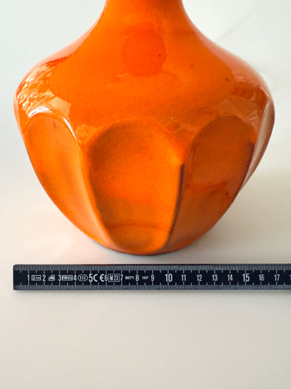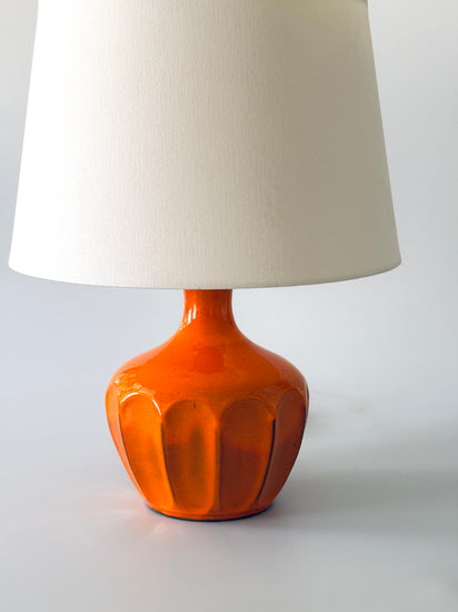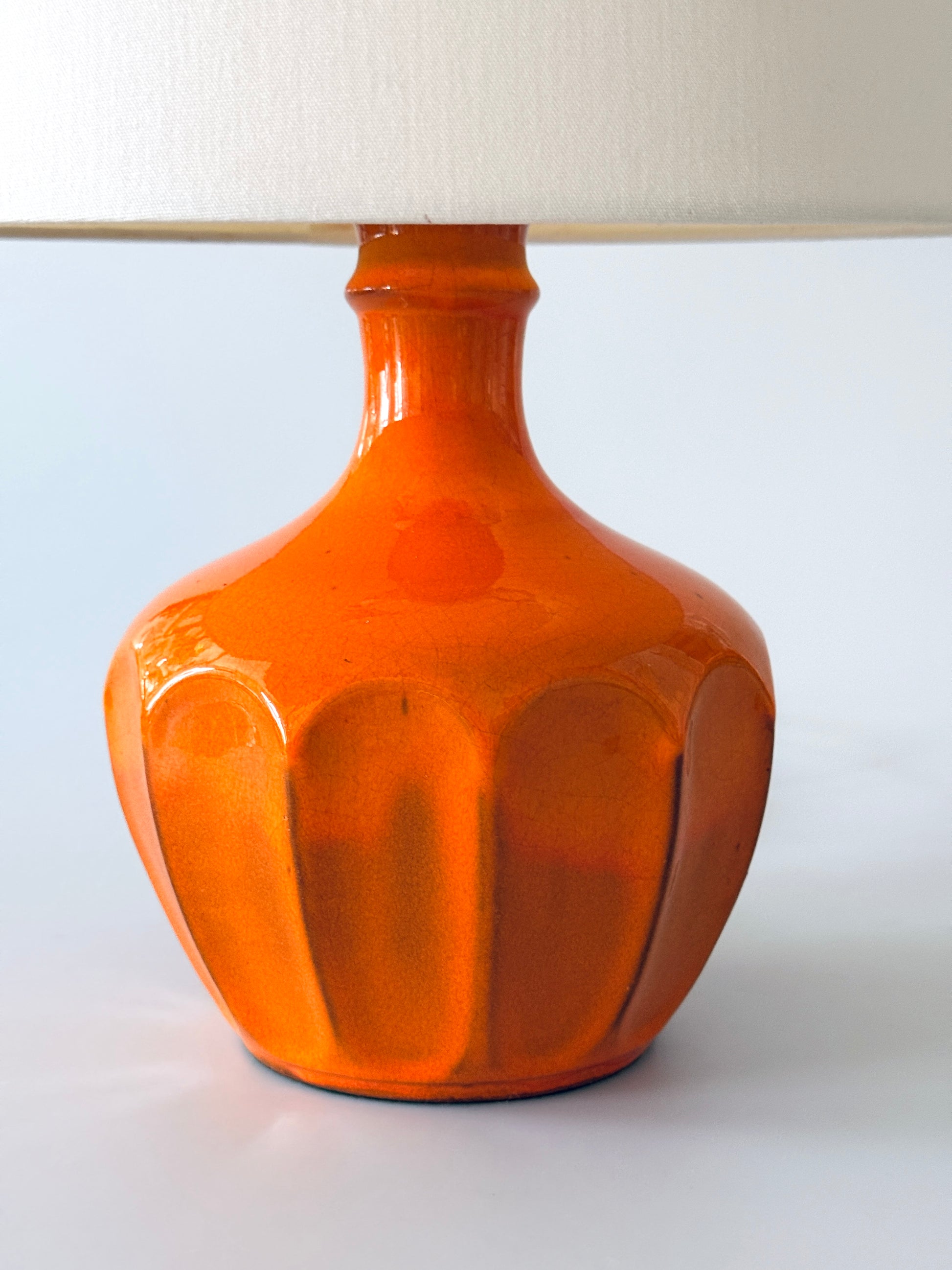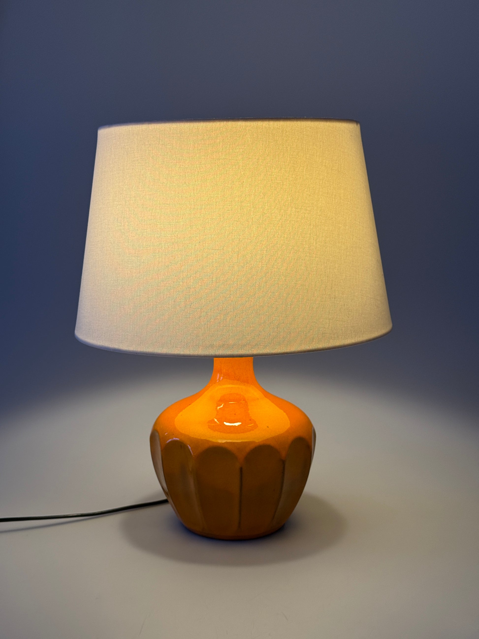 West German Pottery Vintage Chic. Original 1970er Design von Steuler, Westdeutsche Kunstkeramik. Handgefertigter Keramikfuss in leuchtendem Orange mit Baumwoll- Standardschirm. Die Leuchte befindet sich in gepflegtem Zustand, keinerlei Beschädigungen, lediglich leichte Gebrauchsspuren, wie partiell leichteste Verschmutzung am Schirm, siehe Bilder.