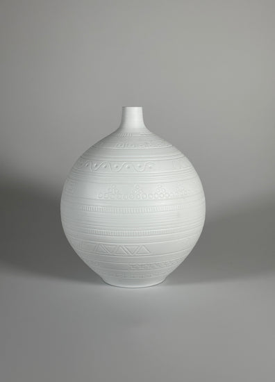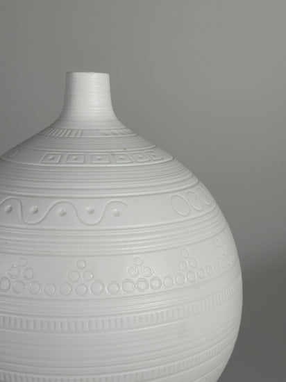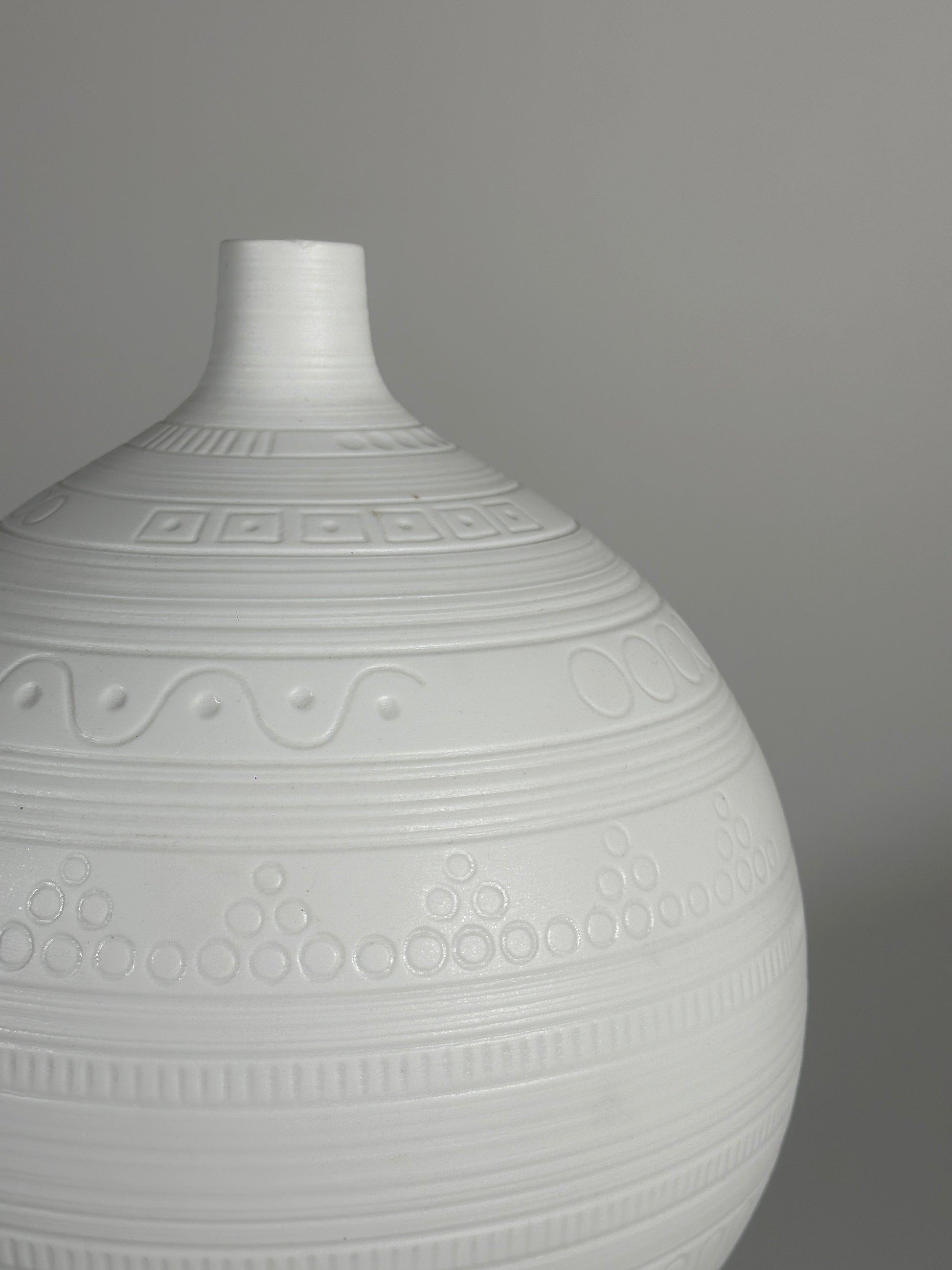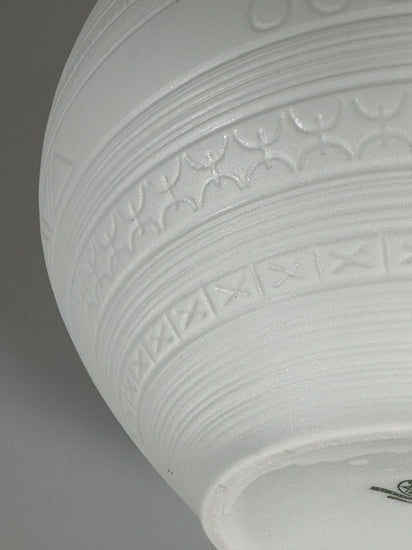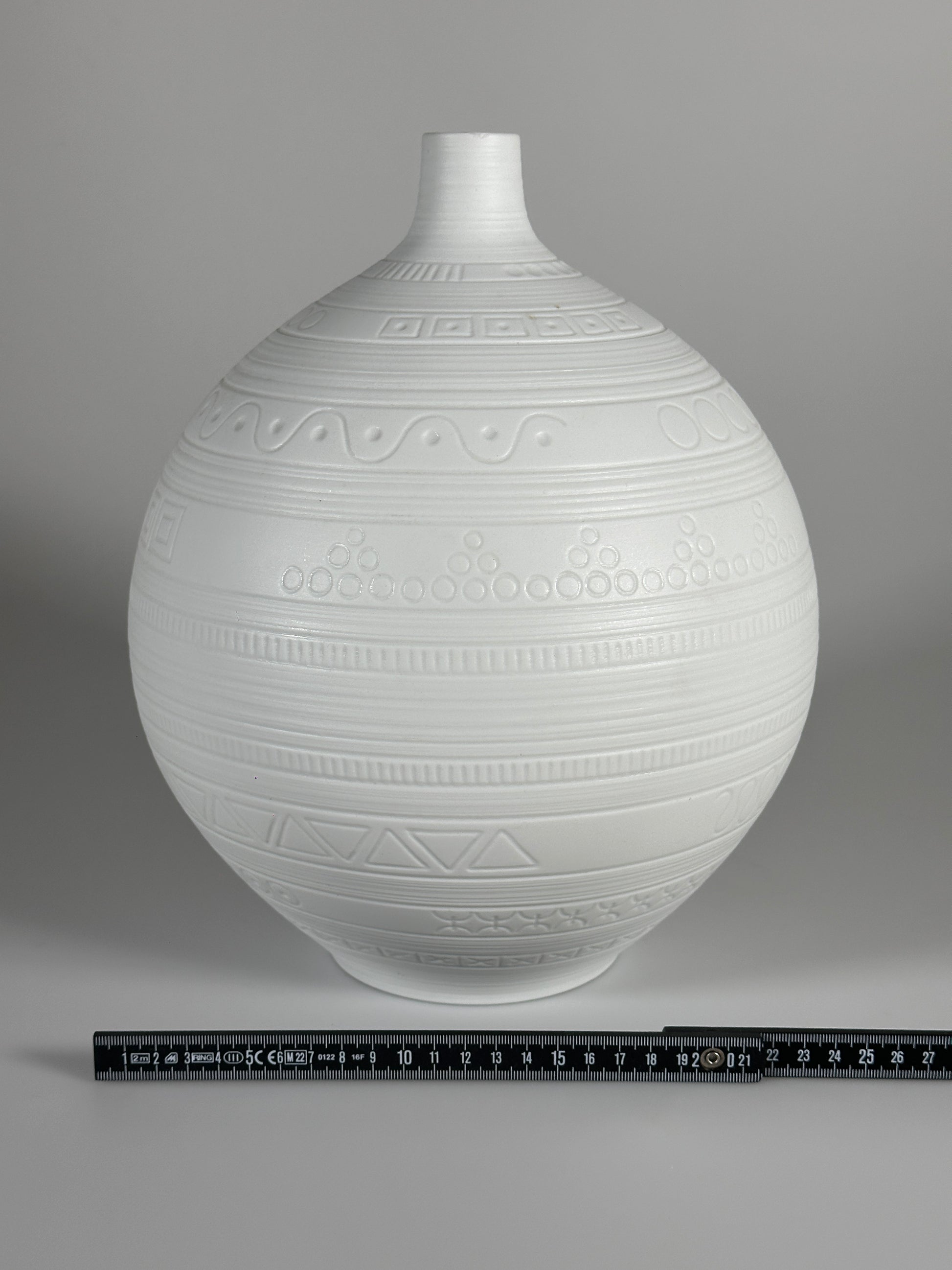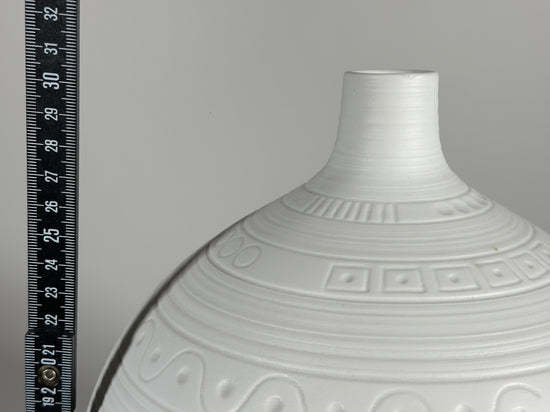 Wunderschöne und große Vase aus Biskuitporzellan, Entwurf von Hans Achtziger für Hutschenreuther, 1960er Jahre Deutschland. Das mattweiße Biskuitporzellan trägt ringsherum ein grafisches Muster.