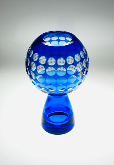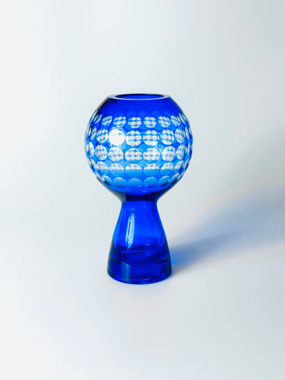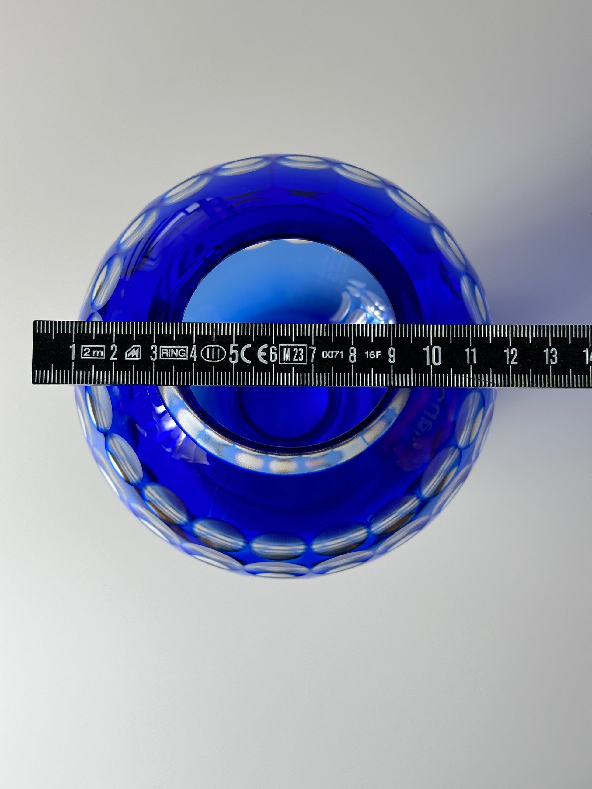 Kristallglasvase aus dickwandigem transparentem und blauem Glas, Entwurf Marita Voigt für VEB Harz Kristall, DDR, 1970er. Die Vase mit Kugelkopf und einem sich kreisförmig wiederholenden Muster sollte in ihrer Form an den Berliner Fernsehturm erinnern und tut das in der Tat auf ihre ganz eigene Weise.