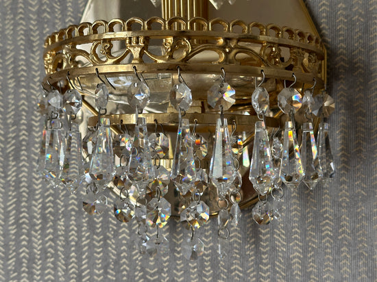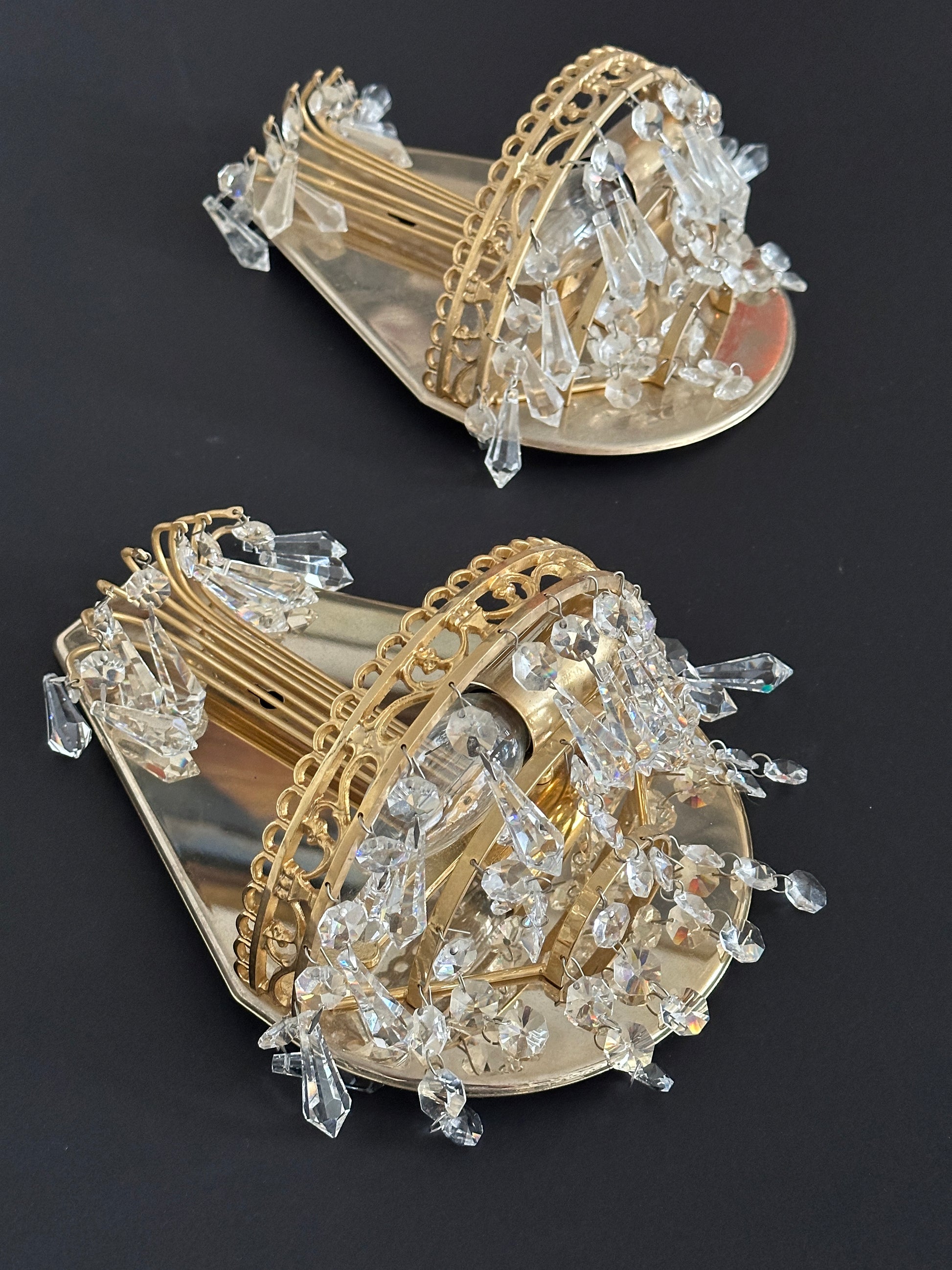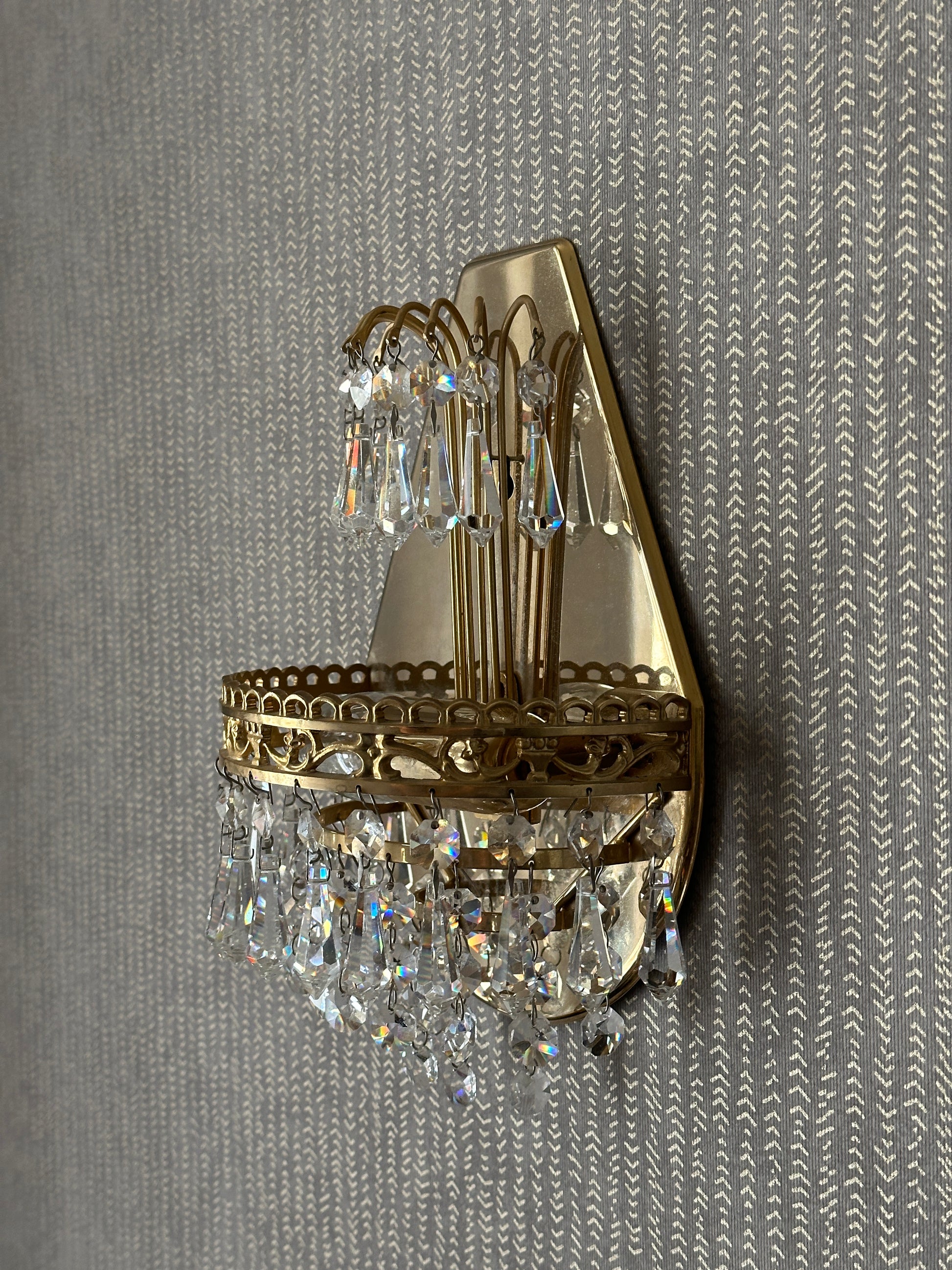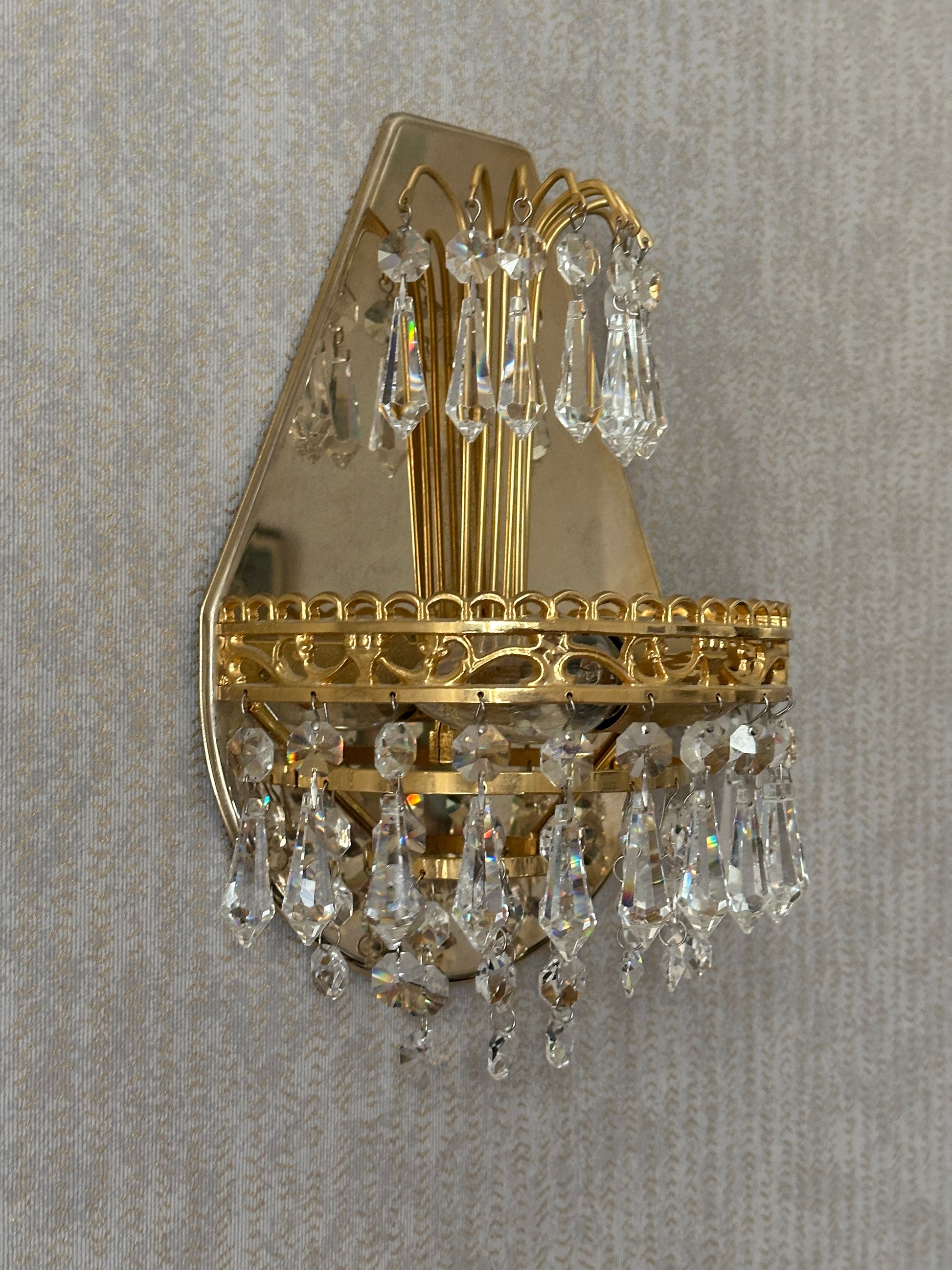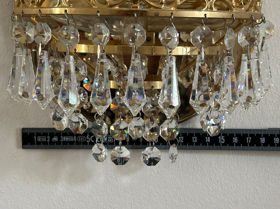 Hochwertig gearbeitete Wandleuchte aus vergoldetem Messing mit Bleikristallbehang. Hersteller unbekannt, vermutlich Palwa, Deutschland, 1950er. Die Leuchte verfügt über eine E14 Fassung, die mit allen gängigen LED-Leuchtmitteln bestückt werden kann. Sie ist in einem sehr guten Zustand, mit nur minimalen Gebrauchsspuren und wurde gereinigt und poliert, der Kristallbehang ist vollständig.